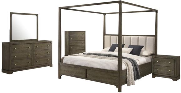 Create a sophisticated retreat in your bedroom with this bedroom set. Featuring a transitional design with rounded corners and trending details, this set includes a canopy bed, nightstand, dresser, mirror, and optional chest.Read More