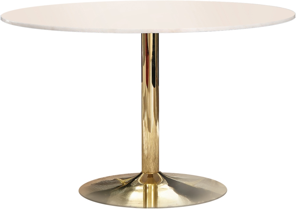 An elevated version of classic simplicity, this modern dining table features elegant details. Shiny and radiant, the subdued silhouette of the base gets a bold pop of color with a metallic brass finish. Dressing up the sleek top is a round white marble-like table top. Create a focal point in a contemporary dining room with an underlying chic motif. The balanced geometric shapes are full of crisp and clean personality.