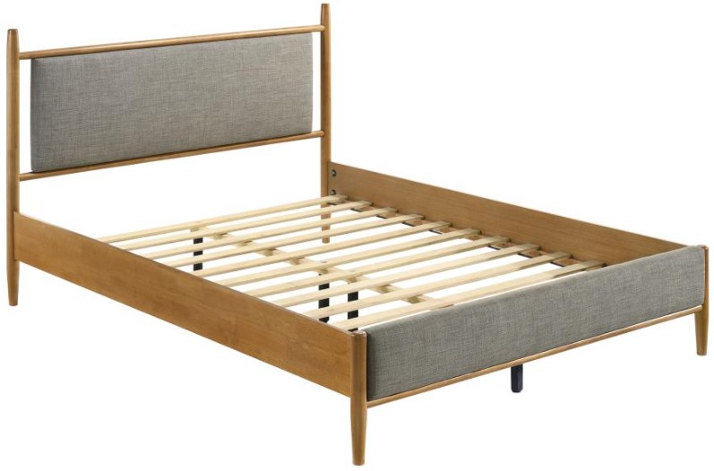 Elevate your retreat with this platform bed, where warm wood and tailored upholstery meet in harmony. The clean-lined frame highlights its mid-century modern influence, paired with a gently padded headboard for cushioned support.Read More