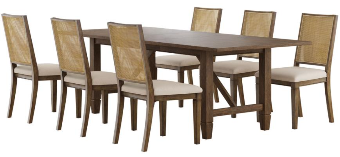 Warm, natural brown wood grain finish pairs with a trestle-style table base