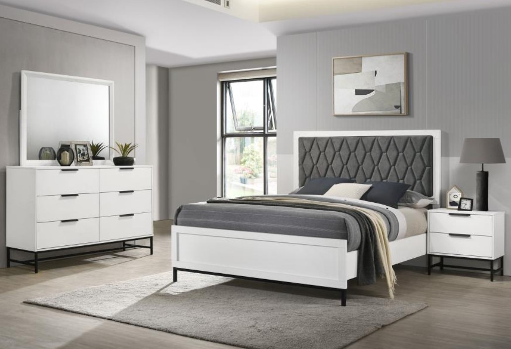 Transform your bedroom with this modern four-piece set, featuring a chic bed with a tall, dark gray tufted headboard and low footboard. Sleek silhouettes and a bright white finish enhance its clean style, while black legs and matching hardware on the dresser and nightstand add cohesion.Read More