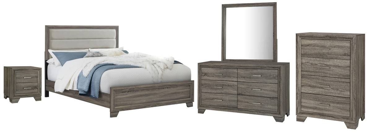 Includes: One (1) queen bed, one (1) nightstand, one (1) dresser, one (1) dresser mirror, and one (1) chest