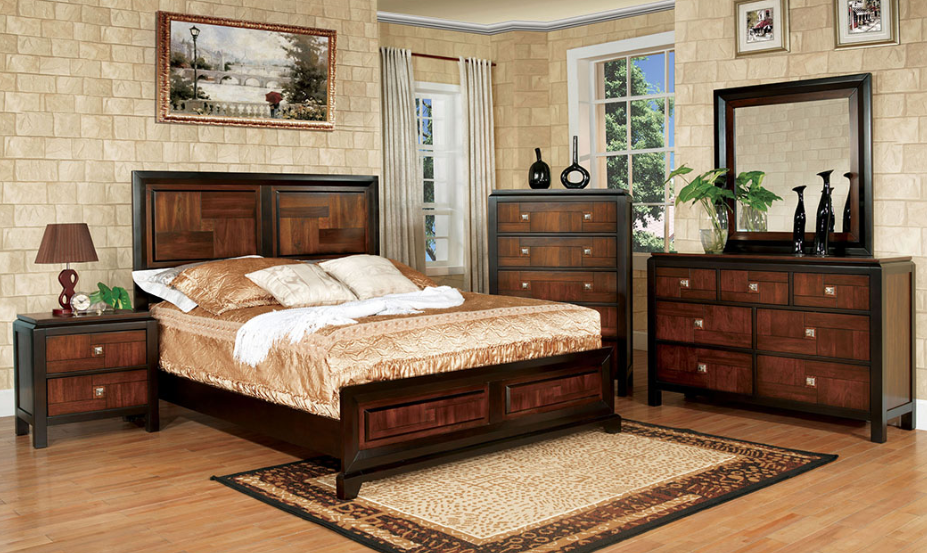 This sharp looking bedroom suite has a unique acacia parquet design on the headboard and footboard with matching case goods. This unique multitone look is accented with square chrome knobs.Read More