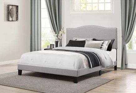 A gorgeous gently arched headboard makes the Kiley Bed a beautiful piece. Silver nailhead trim on the upholstery draws the attention in. Any finish of the Glacier Gray, Linen, or Fog fabric pairs wonderfully with the espresso wood legs. Low-profile matching upholstered side rails and foot rails complete the bed. The Kiley Bed is an excellent for any master or guest bedroom with its transitional style, it can go with almost any décor. Assembly required. Mattress and boxspring required.